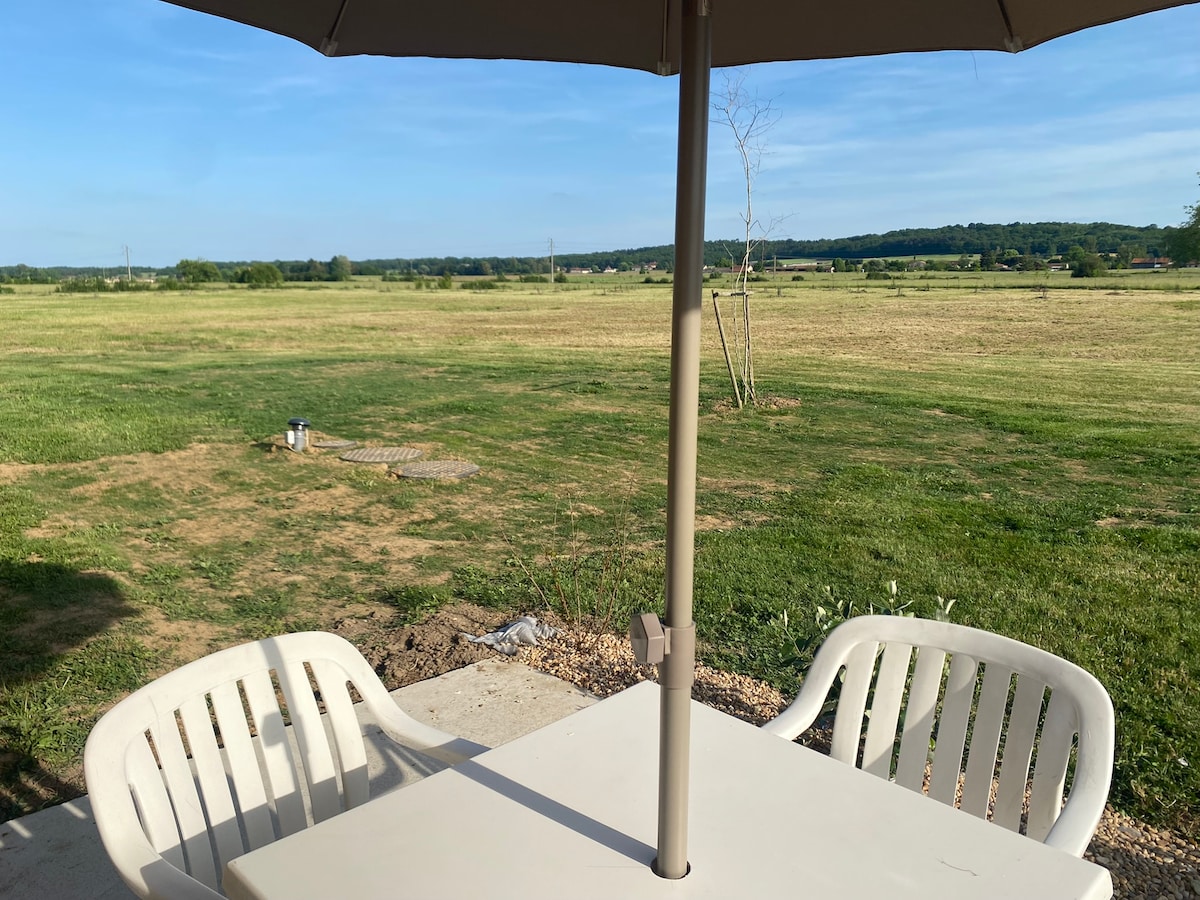 Розслабтеся в цьому затишному та стильному помешканні. У студії площею 20 м2 ви знайдете обладнану кухню (холодильник, мікрохвильову піч, кавоварку сенсео тощо), телевізор, журнальний столик із підйомним піддоном для їжі, велике ліжко (160*200) та ванну кімнату з великою душовою кабіною. З боку вулиці ви знайдете терасу зі столом і стільцями та барбекю з видом на зелену сільську місцевість. Можливість надати дитяче ліжко, якщо це необхідно