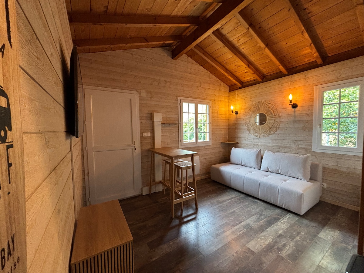 Незалежний дерев 'яний котедж, весь комфорт і ідеально обладнаний на приватній землі площею 500 м2. Маючи 2 спальні, ванну кімнату, вітальню-кухню, веранду та відкриту терасу площею 30 м2, мають затишне помешкання між сосновим лісом Ландеса, ставками та 9 км від океану (також на велосипедній доріжці). Помешкання знаходиться в дуже природному житловому парку. На території площею 3 га затишне та спокійне. Доступний спільний басейн