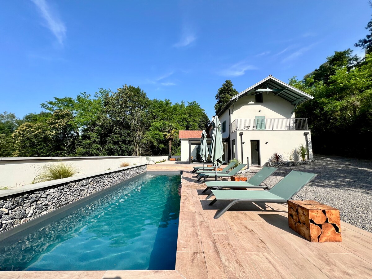 Поруч із Піренеями в центрі спокійного села, повністю відремонтований фермерський будинок, що поєднує в собі шарм старого та сучасного. Будинок, що примикає до незалежної частини, в якій ми живемо. велика вітальня площею 75 м² з обладнаною кухнею та критою терасою з планом. На першому поверсі 3 спальні з гардеробною кімнатою та телевізором на стелі. Ванна кімната з італійським душем та бальнео. Сушильна машина, пральна машина та холодильник. Відкрита тераса з гідромасажною ванною!! Басейн з 2 басейнами!! ДЕБЕТОВЕ ВОЛОКНО