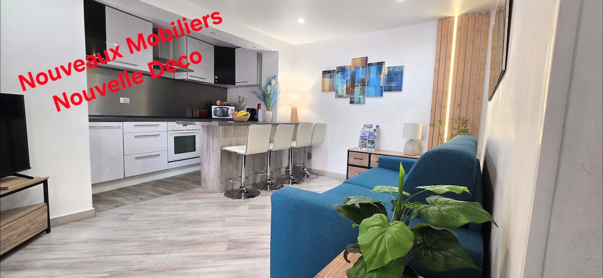 Квартира відремонтована (травень 2020 року). Він складається з кухонної зони, відкритої для вітальні, з якої відкривається вид на чарівний балкон. Також є душова кімната з сушильною машиною для рушників та пральною машиною. Туалети є окремими. Нарешті є маленька спальня. Увага, щоб отримати доступ до ліжка, потрібно піднятися на кілька сходинок.