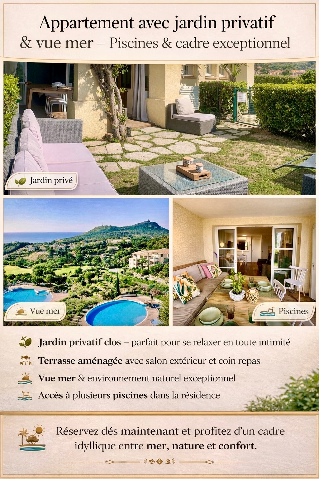 🌿 LE JARDIN DE L’ESTÉREL –VUE MER - ÉVASION & TOUT CONFORT POUR 4 PERSONNES Logement Classé PREMIUM ⭐️⭐️⭐️ ⭐️ Rénové et Climatisé 💎 : 📌 Les plages sont accessibles à pied à 10 minutes en bas du village vacances L’endroit le plus préservé de la Côte D’Azur. INCLUS = 💦—> 4 PISCINES dont une chauffée + —> Animations en journées et Soirées ( d’avril à début Novembre ) 🚗 Parking 🅿️ Couvert