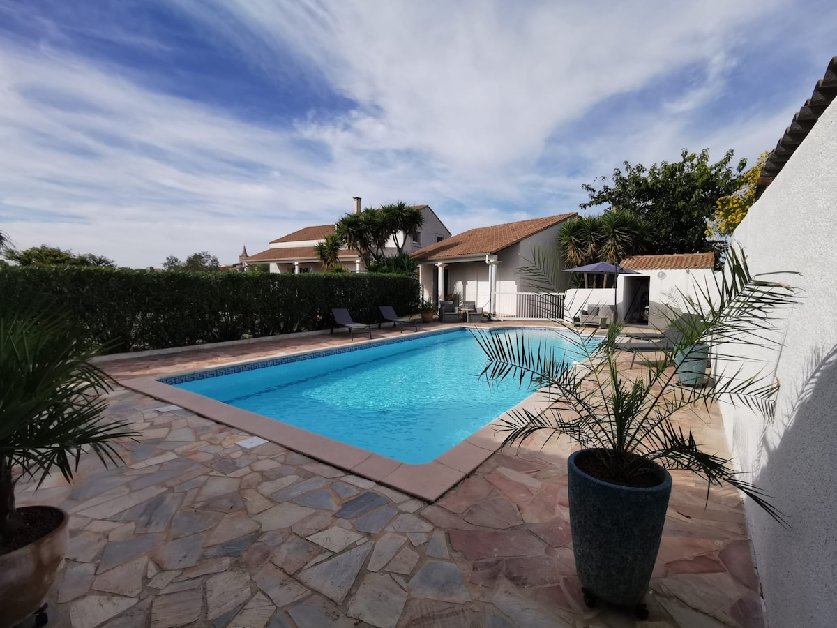 Цей красивий відремонтований будинок із кондиціонером, розташований на виноробні Сен-Тіберрі, має приватну терасу. Wi-Fi, пральна машина. Це забезпечує тишу в сільській місцевості. Ви можете відпочити в приватному басейні садиби або в лісистому парку. До курятника можна дістатися власником, овочі з овочевого саду можна придбати на місці. Селище розташоване неподалік. Близько до пляжів (15 хвилин), виїзд на шосе (5 хвилин). Вільно володію англійською