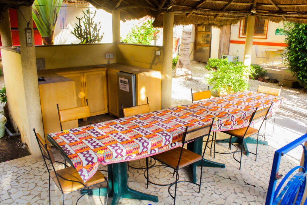 Espace privé disposant d'un extérieur sans vis à vis avec un coin pour manger et se détendre. Entrée privée qui mène à votre chambre et salle de bain attenante. Situés dans un quartier typiquement sénégalais, animé par les rires des enfants et le bruit des animaux:biquettes, oiseaux, coq. Des coupures d'eau peuvent arriver, vous aurez des réserves à disposition. Auchan, plages, marchés à 10 minutes. Possibilité de vous récupérer à l'aéroport. Plongez dans une expérience locale et authentique.
