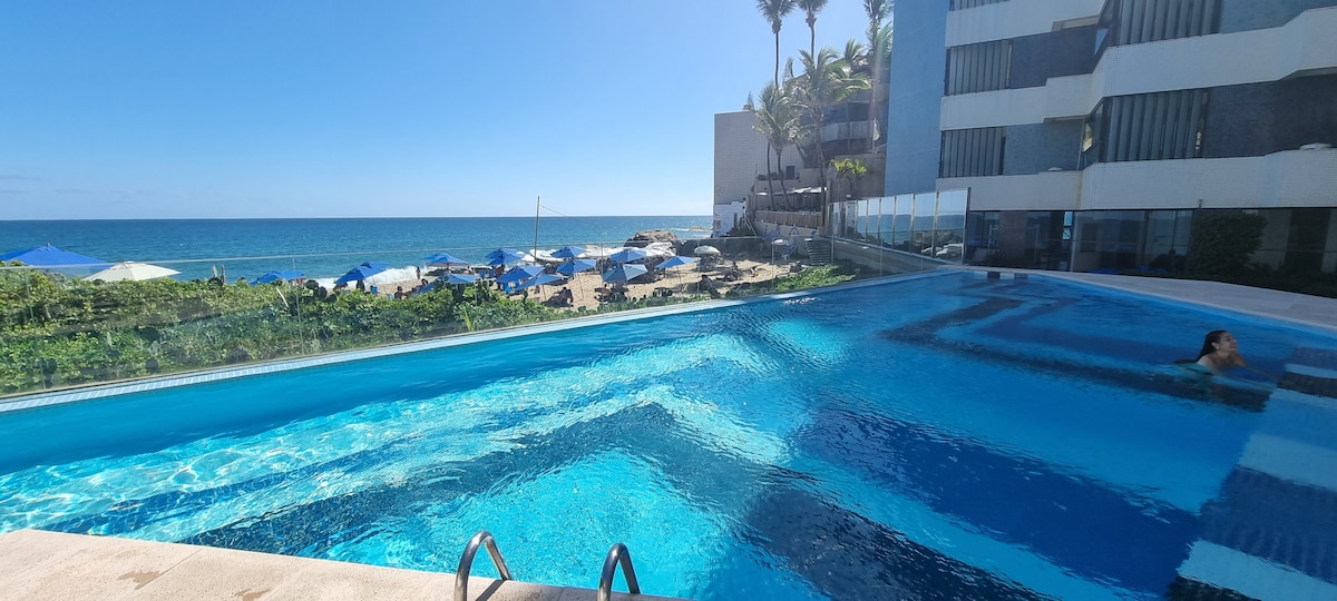 Переходите вулицю, і ви на піску пляжу, в морі! Коли повернетеся, як щодо того, щоб трохи більше відпочити в басейні на терасі з панорамним видом на море Ондіни? Затишна квартира-студія навпроти прекрасного пляжу з природними басейнами, сейф, цілодобова стійка реєстрації, щоденне прибирання, басейн на терасі, ліфт, гараж і магазини в будівлі. Ондіна – один із найкращих районів для проживання в Сальвадорі, оскільки тут є зручності та гарна відремонтована набережна. Precioso Place!