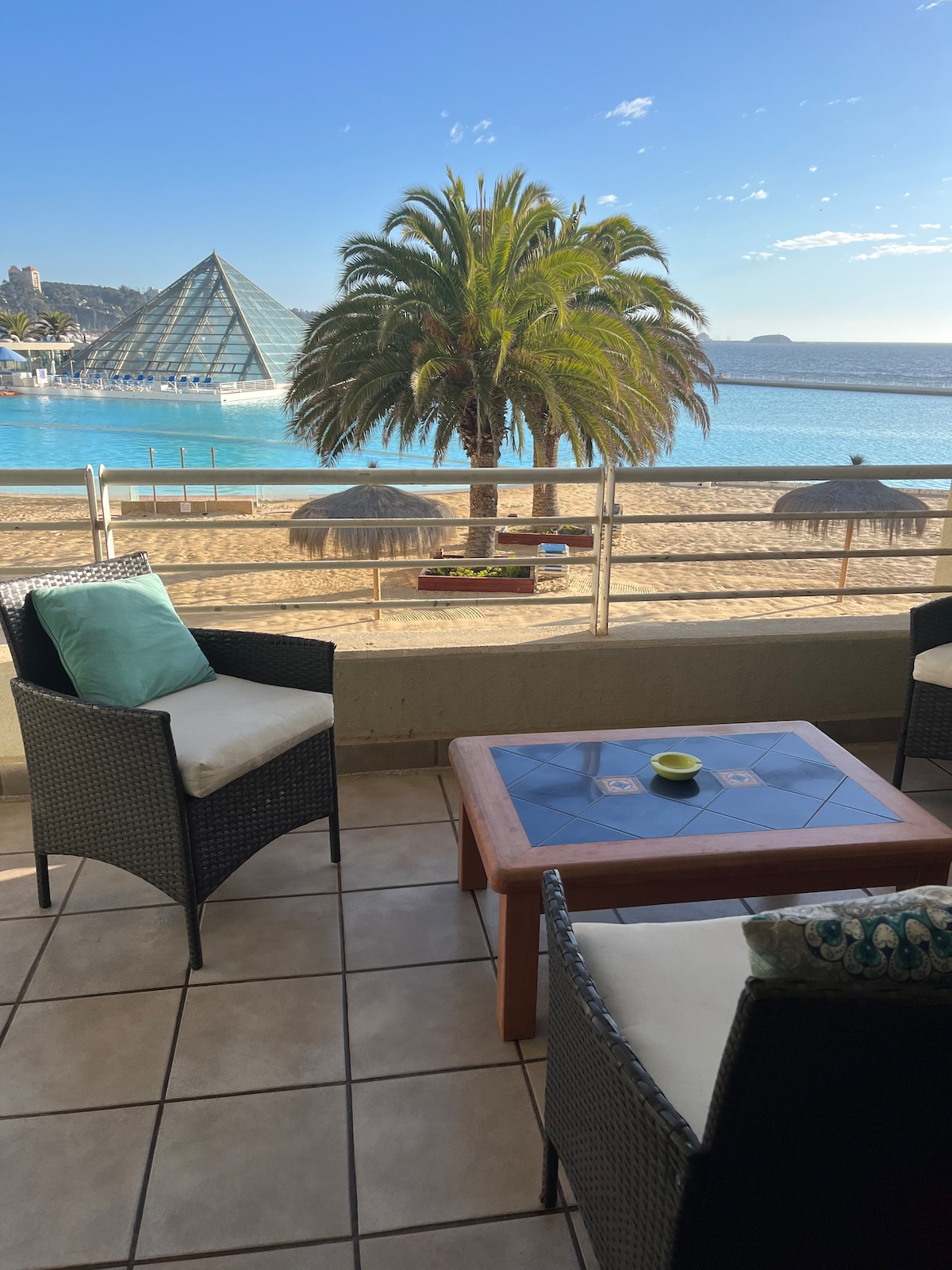 Вражаюча квартира в Сан-Альфонсо-дель-Мар, Альгарробо. Дві спальні, дві ванні кімнати, вітальня, міні-кухня, телевізор, велика тераса з панорамним видом на затоку. Дуже безпечний кондомініум, штучна лагуна, невеликі басейни, басейни з помірною температурою, джакузі, сауна, пляж і вихід до моря. Ресторани, футбольні поля, волейбол, теніс та ігри для дітей. Примітка: після пандемії доступ до басейну з підігрівом, джакузі та сауни обмежено.