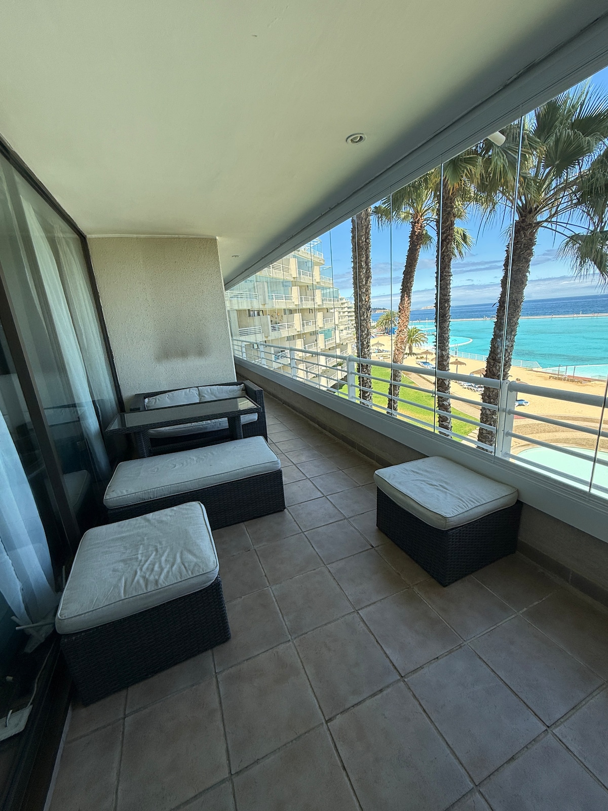Departamento casi nuevo, excelente estado, cómodo, iluminado, equipado, con malla de protección para menores de edad, buena vista a piscina y al mar. Calefacción central. English spoken. Ingreso por Bahía Sur. El Departamento recibió reciente mantención, fue decorado con muebles y adornos de calidad. El edificio posee lavadoras y secadoras que funcionan con fichas que se adquieren en administración. Existe Wifi inalámbrico en interior del Departamento, además otro en Lobby del edificio.