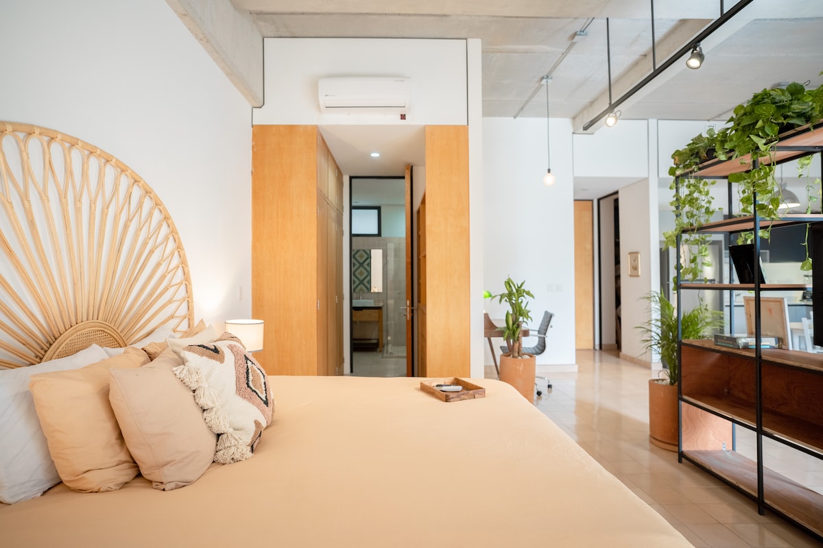 Красивий та елегантний лофт дуже близько до центру міста Тлакепаке, де ви знайдете кулінарні, культурні враження, зручності та нічне життя, за кілька хвилин ходьби від поїзда, який з’єднує все місто. У лофті є кондиціонер у кімнаті, кухонній зоні та вітальні, є дощовий душ високого та середнього тиску, цифровий замок, дисплей 4K, високошвидкісний Інтернет 210 Мбіт/с і датчик CO2. У ньому немає гаража Насолоджуйтеся стильним і елегантним перебуванням