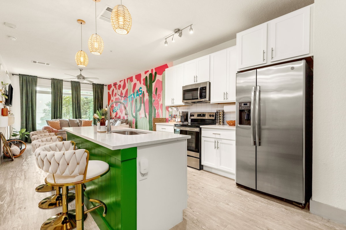 Завітайте до дизайнерської квартири в стилі курорту з 2 спальнями та 2 ванними кімнатами в Сан-Антоніо – Zenful Affirmations. Ця квартира з закритим доступом, блискучим відкритим басейном і сучасним тренажерним залом, а також зручними меблями ідеально підходить для тривалого перебування. Усе включено – всі комунальні послуги, швидкий Wi-Fi, кухонне приладдя, засоби для прибирання, повнорозмірна пральна машина/сушильна машина – щоб ви могли заселитися без жодних клопотів. Тварини також дозволені! Ми з нетерпінням чекаємо на вас у Zenful Affirmations!
