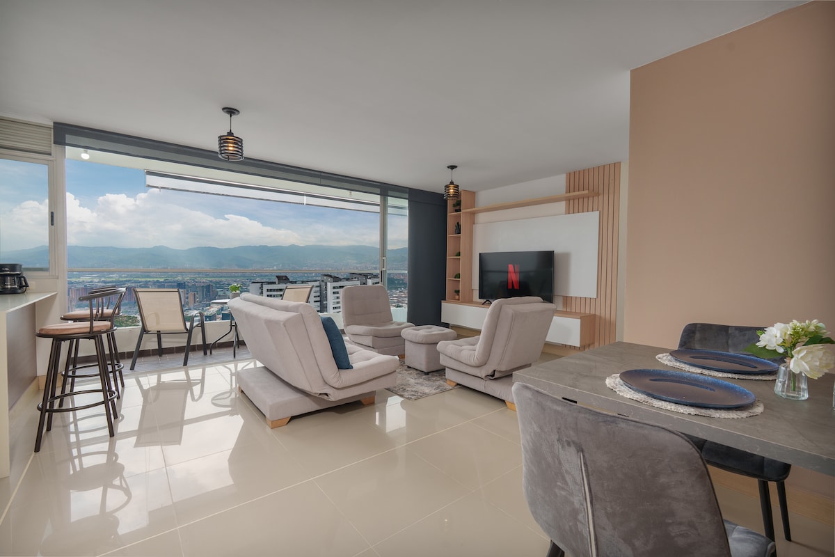 НЕЩОДАВНО ВІДРЕМОНТОВАНО - Високошвидкісний Інтернет чудово підходить для віддаленої роботи. - Бренд новий кондиціонер. - Повністю відремонтована квартира з промисловим дизайном. - Ліжко розміру King size - Чудові краєвиди на Медельїн (повірте мені, варто зупинитися тут) - 19-й поверх - Чудове розташування в Побладо поблизу Провензи та парку Лєрас. - Сучасні зручності - Простора вітальня. - Smart TV x 2 - Повністю обладнана кухня. - Пральна та сушильна вежа - Басейн. - Тренажерний зал. - Робочий простір - Ресторан всередині будівлі - Приватна парковка. - Самостійна реєстрація прибуття - Цілодобова охорона