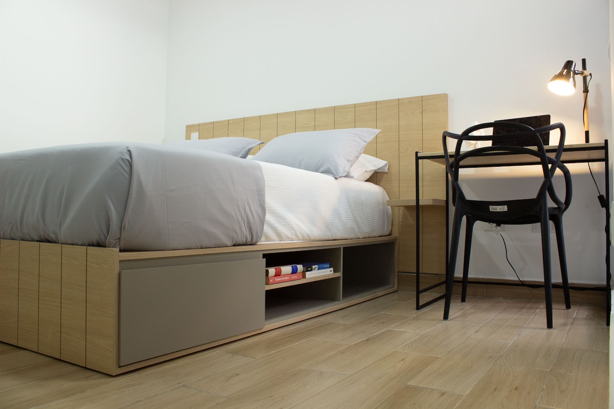 Ласкаво просимо до нашої шикарної та затишної квартири-студії, розташованої в яскравому центрі Побладо. Розташоване всього в декількох хвилинах від парку Лєрас і Провенца, ви зануритеся в найкращі ресторани, кафе та нічні клуби Медельїна. Насолоджуйтеся високошвидкісним Wi-Fi, обладнаною кухнею, гарячою водою, щоденним прибиранням та окремим балконом. У нашому чудовому місці є приголомшливі зони спільного користування, цілодобова двомовна стійка реєстрації та охоронець. Ви всього в 3 хвилинах ходьби від торгового центру Zona 2.