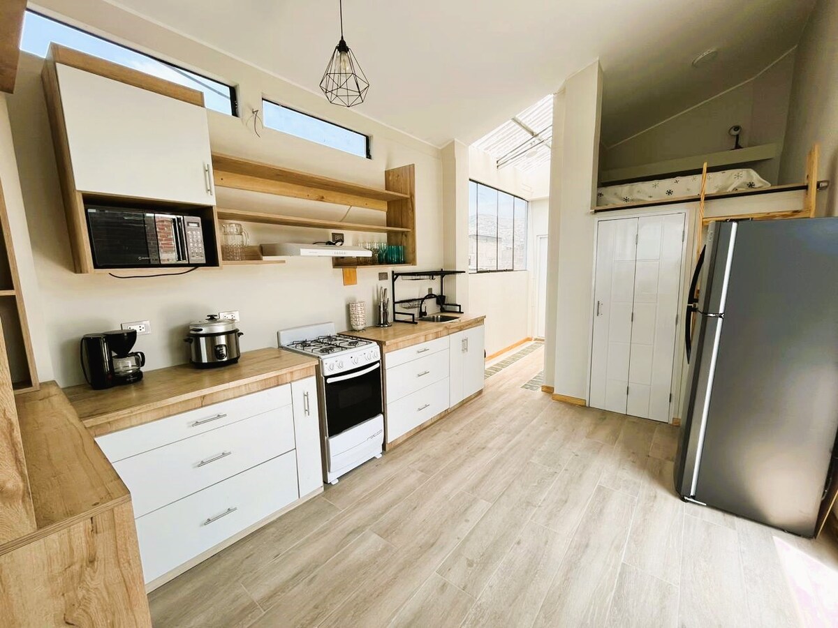 Mini depa privado e independiente en 2do. piso (acceso con escaleras) completamente amoblado, consta de tres ambientes: Dormitorio con cama queen size, amplio closet y escritorio, Wifi fibra óptica, Smart TV 50” con WinTv, Cocina/comedor, 1 sofá cama y al lado baño completo privado. Áreas comunes como terraza, jardín y piscina son de uso compartido. Barrio tranquilo y seguro, vigilancia privada. Cerca de avenidas con trasporte público, bodegas, banco, lavandería, restaurantes, farmacias, etc.