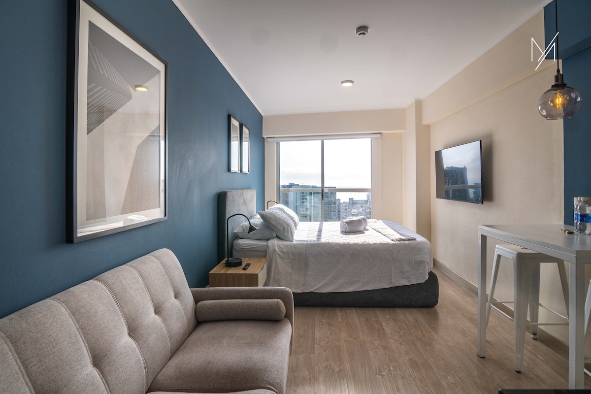 Красива квартира, розташована на межі Чоррільоса з Барранко, в 5 хвилинах від станції Мателліні, звідки можна дістатися до столичного транспорту, який курсує по всіх районах Ліми. Ви знайдете все необхідне для комфортного перебування, зокрема вітальню та міні-кухню, кімнату з ліжком queen-size, 75-дюймовий телевізор, гостьову та основну ванну кімнату, ідеальну студію для роботи, навчання або приємного відпочинку.
