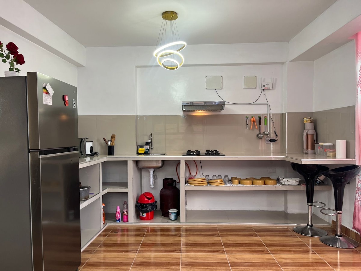 Насолоджуйтеся комфортним, просторим і повністю приватним перебуванням у цій стильній квартирі в Мойобамбі. Вона має 2 спальні (1 двоспальне ліжко розміру Queen size та двоповерхове ліжко з 2 ліжками внизу та 1,5 ліжком зверху), 2 повноцінні ванні кімнати та ідеально підходить для сімей і пар, які шукають комфорт і функціональність. Квартира розташована на другому поверсі, що забезпечує більше приватності, і має вітальню, повністю обладнану кухню та зручно облаштовані приміщення для комфортного перебування. У тихому та затишному помешканні є надійний Wi-Fi і телевізор.