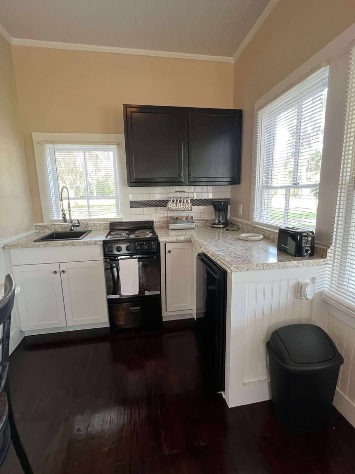 Bring your fishing gear or small boat to enjoy a fun getaway at the Captain's Cottage with a dock on Lake Stella. Key-less entry allows for self check-in and welcomes you to this comfortable clean 962 sq. ft. space with two queen size beds, one bathroom, full kitchen, florida room, and a fenced-in backyard. A paddle boat is provided. Three kayaks and 2 bicycles are also available! Or you can bring your boat and go fishing! Enjoy swimming, lovely sunsets and strolls around the beautiful lake.
