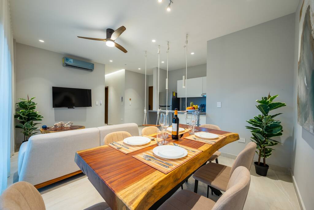 Відвідайте нашу розкішну квартиру з 2 спальнями в центрі Косумеля! Ця квартира з приголомшливими терасами, сучасною вітальнею та високоякісними зручностями - ідеальне місце, щоб розслабитися і насолодитися спокоєм острова. Відпочиньте перед телевізором із плоским екраном, пообідайте за стильним столом на шість осіб або приготуйте власні страви на повністю обладнаній кухні. Наші затишні спальні мають ліжка розміром Queen size, приватні тераси та розкішну постільну білизну для спокійного нічного сну.