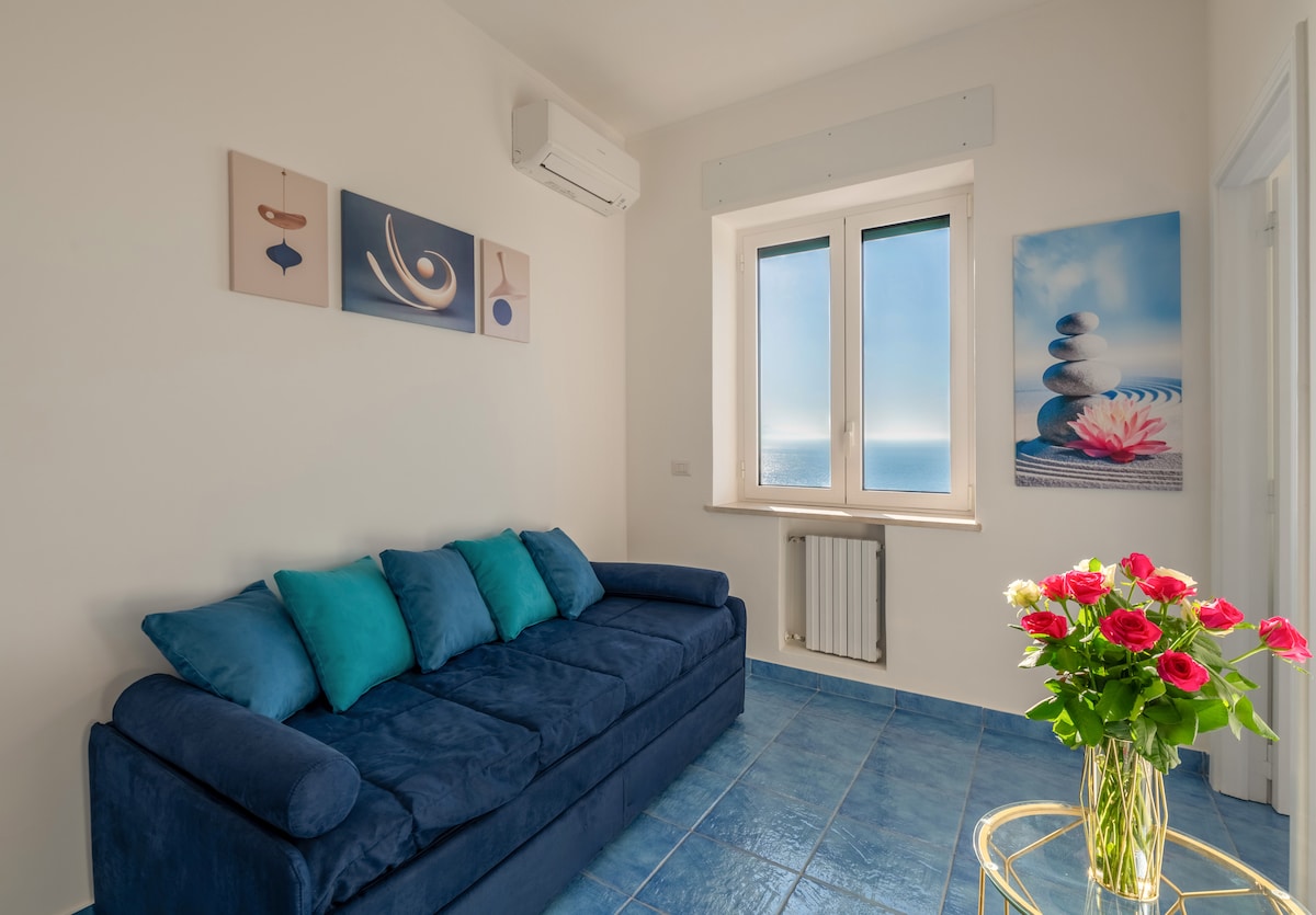 Two room flat with bathroom located at the first floor (no elevator) of a private building, completely renoved with modern style, precious furnitures and accessories, full air conditioned. Enchanting seaview of Capri and the Gulf of Naples from the terrace and the many windows of the flat (except bathroom). Located at the centre of the town, 10 meters from the main square of Massa Lubrense, a typical quiet village of Sorrento Coast, just 5,5 km from Sorrento and 18 km from Positano