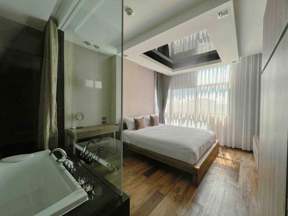 俯瞰市中心山景泳池公寓套房、大露台、健身房、免费停车场,网速快,月租优惠