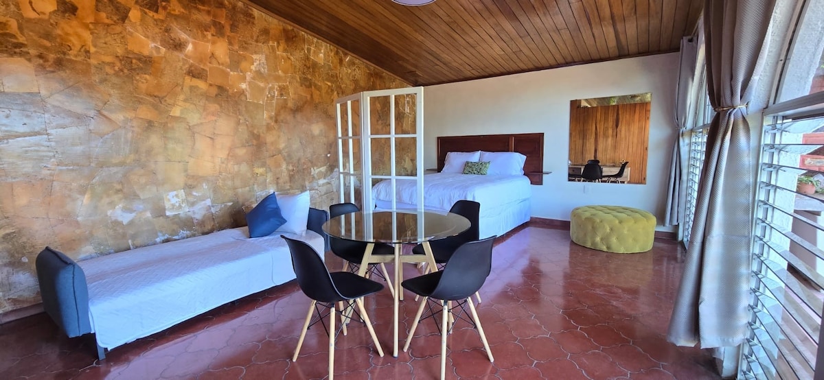 Habitación -muy acogedora en un hotel boutique silencioso en colonia Escalón. Rodeado de naturaleza, en el corazón de la ciudad, excelente ubicación. A 4 cuadras de galerías, monumento al Divino Salvador del mundo, con mas de 50 restaurantes alrededor. Fácil acceso al centro histórico, Gasolineras, super mercado, y centros comerciales. Completamente equipado y con acceso a cocina, comedor, patio. Fácil acceso a carreteras hacia el aeropuerto, playas, lugares turísticos y transporte público.