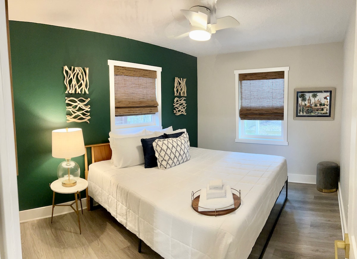 Затишний реконструйований заміський будиночок може похвалитися розкішним оздобленням інтер 'єру, зберігаючи при цьому привабливість історичного центру Сент-Огастина. Приходьте і насолоджуйтеся автентичним досвідом перебування в одному з небагатьох «заміських будинків із рушницею», які досі стоять в історичному Лінкольнвіллі. Пропонуючи 2 спальні з великим двоспальним ліжком, де ви будете насолоджуватися розкішною постільною білизною, матрацами з пам 'яттю, стельовими вентиляторами, великими шафами та витворами мистецтва на замовлення. Насолоджуйтеся спа-подібним туалетом із каскадною каскадною плиткою та гальковою підлогою для душу з нескінченною гарячою водою.