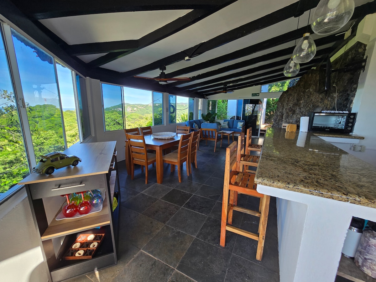 Complete tropical house for 7 people with incredible views: Surrounded by nature, with 180-degree views of El Sunzal Beach in Surfcity, one of the most renowned beaches for surfers and tourists from all over the world. The house is located in a private residential area. It features a minimalist, open design in harmony with nature. Relaxing pool and gardens. Bedrooms with AC 2 TV 35 Mbps internet.