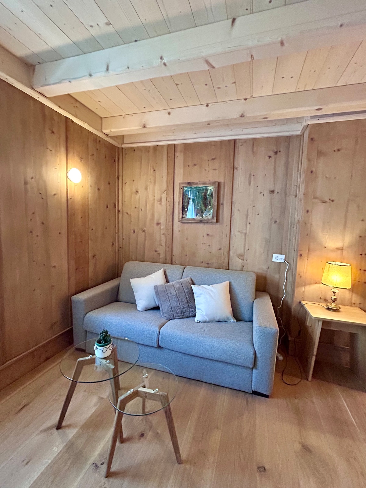 Красивий дерев’яний зруб, обладнаний двоспальним ліжком, ванною кімнатою, міні-кухнею (холодильник, столові прибори, посуд та чашки включені), Wi-Fi, телевізором, приватною парковкою... розташований у великому приватному саду вілли. 100 м від велосипедної доріжки Доломіти. Розташоване перед красивим ставком. Включно з прибиранням та зміною білизни кожні три дні, за винятком міні-кухні. Огороджена та приватна зона для собак (620 квадратних метрів) включена в ціну. Барбекю на відкритому повітрі.