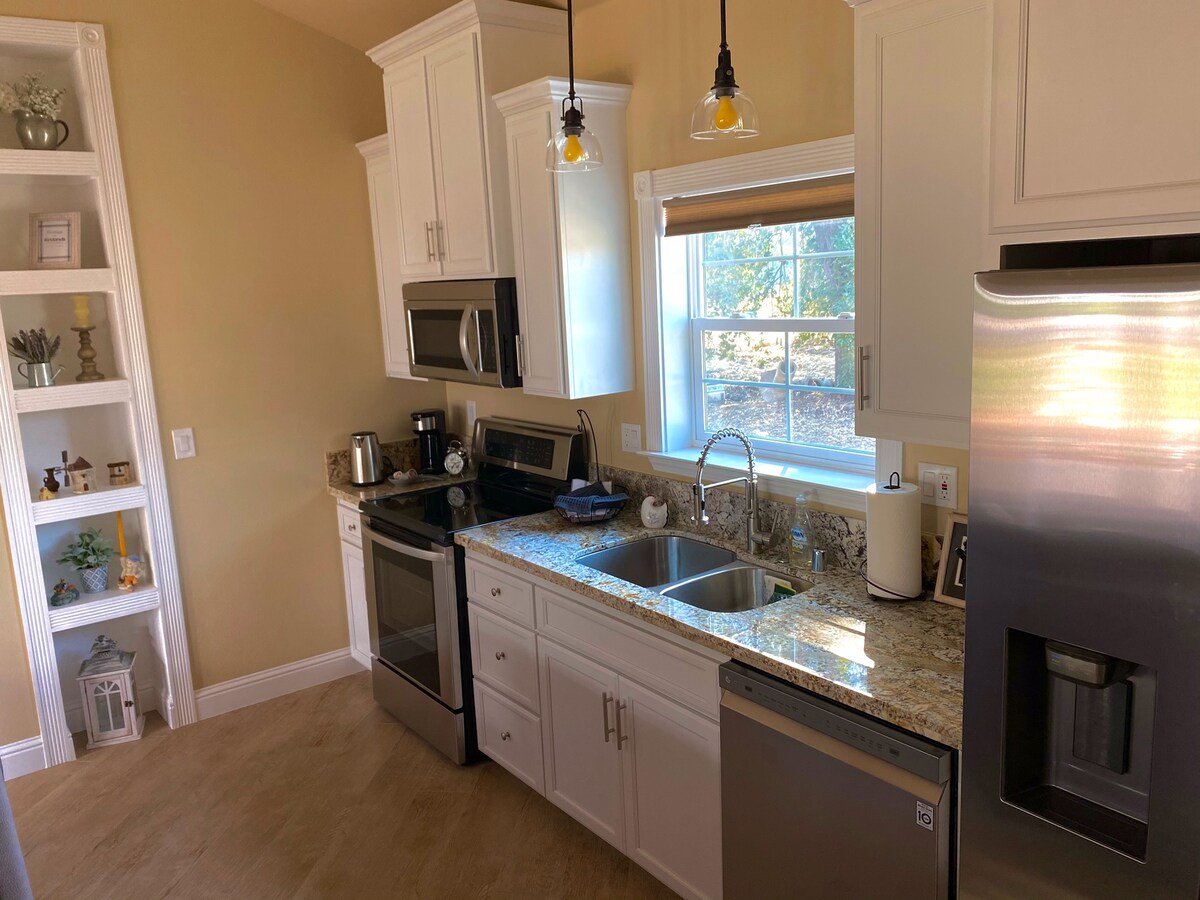 Просторий будинок із заміським котеджем. 2 спальні, 2 ванні кімнати розташовані в передгір 'ї Сьєрра-Леоне. 6 красивих акрів у парку. Обгорніть веранду, барбекю на свіжому повітрі, джакузі, джакузі в головному апартаменті, відкриту беседку та багато іншого. Привітні коні та собаки. Приватний доступ до всіх 6 акрів. Близько до національних парків Кінгс-Каньйон/Секвойя. Свіжі яйця, бомби для ванни з водоспадом та безкоштовна пляшка вина - це лише кілька додаткових послуг.
