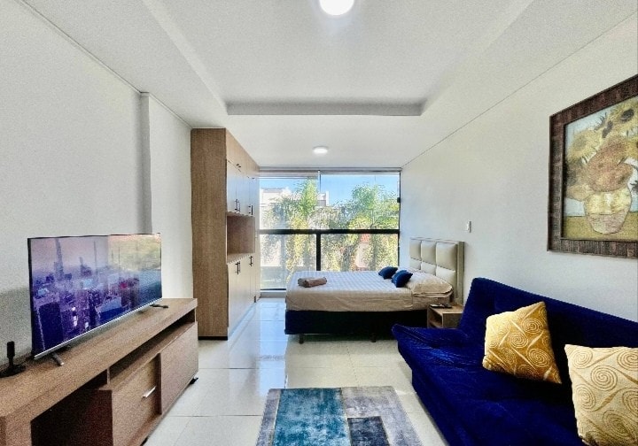 Затишна нова квартира в сучасній будівлі Spazios, в ексклюзивному районі Equipetrol. Квартира з однією спальнею з двоспальним ліжком, одним диваном-ліжком, столом, щоб ви могли працювати, повністю обладнаною ванною кімнатою, шафою, вітальнею зі смарт-телевізором, кондиціонером, пральною машиною та всім необхідним для комфортного та спокійного перебування. Поруч кафе, ресторани, бізнес-центри, супермаркети, магазини, аптеки, всього 7 хвилин від центру міста, і найкраще — у безпечному районі.