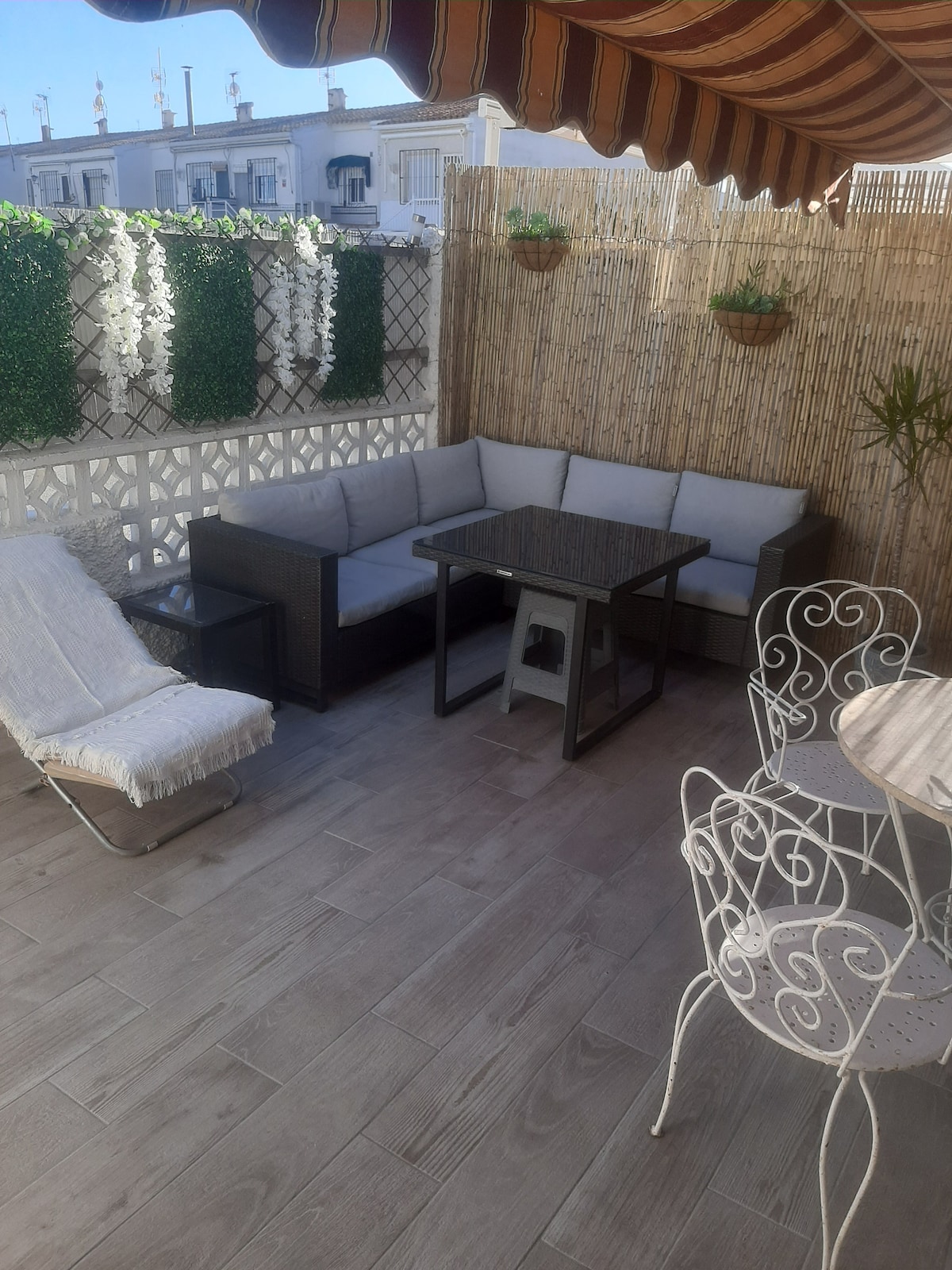 Бунгало в оренду на першому поверсі в закритому комплексі з 2 басейнами в Сьюдад-Кесада. Загальна площа 85 м2, складається з 2 спальні, простора вітальня, кухня, дві ванні кімнати, 2 тераси. Тут є паркувальне місце. У квартирі є все необхідне для комфортного проживання та відпочинку: нові меблі, побутова техніка (включаючи кавоварку, тостер, посудомийну машину), посуд, постільна білизна та рушники. Квартира обладнана кондиціонером. СМАРТ-ТЕЛЕВІЗОР, WI-FI