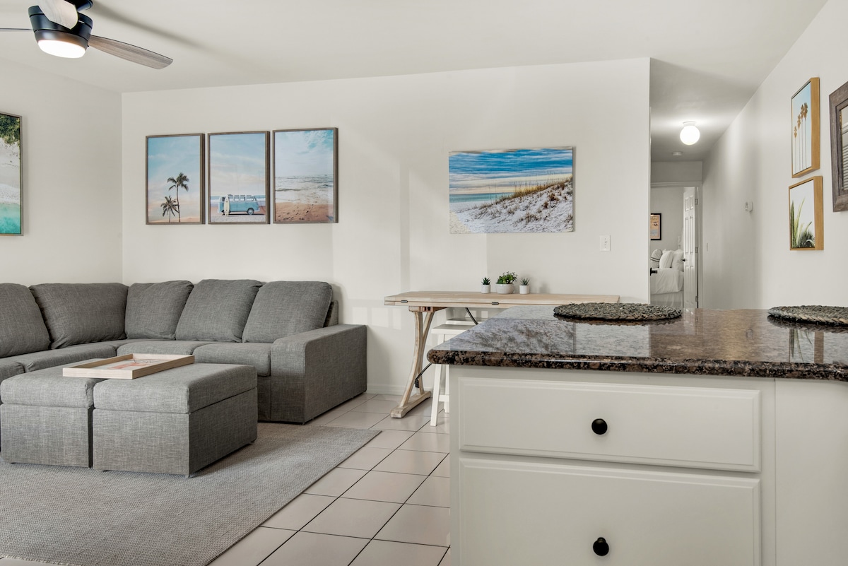 5-7 хвилин пішки до пляжу~фітнес-центр і басейн на території~знижка 10% на прокат гольф-кару~ пішки до ресторанів~ 2 пляжні стільці-рюкзаки~один пляжний візок~2 пляжні рушники Залиште свої турботи позаду, зупинившись у «Happy Hour Hideaway»! Розташована на сумнозвісному шосе 30а, вам сподобається перебувати так близько до дій, водночас насолоджуючись усамітненням цього комплексу. Це квартира з 1 спальнею + двоповерне ліжко в коридорі/2 ванними кімнатами, розташована на першому поверсі комплексу. Для вашої зручності