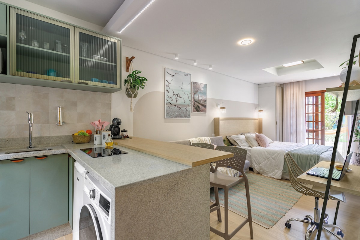 Студія перебудована! Проєкт був завершений, щоб зробити його новим, милим і функціональним. Поруч із центром Лагоа, дуже зелене місце, басейн, дитячий майданчик, барбекю (за додаткову плату), ігрова кімната, міні-маркет, доступ до Лагоа та прокат байдарок і велосипедів Ідеально підходить для екскурсій/роботи. Дуже тихий, стратегічно добре розташований на острові з легким доступом до пляжів. Швидкий і стабільний Інтернет. Ваша домашня тварина буде вітатися (кондомініум стягує 50 R$. (Оплата через Airbnb або на стійці реєстрації)