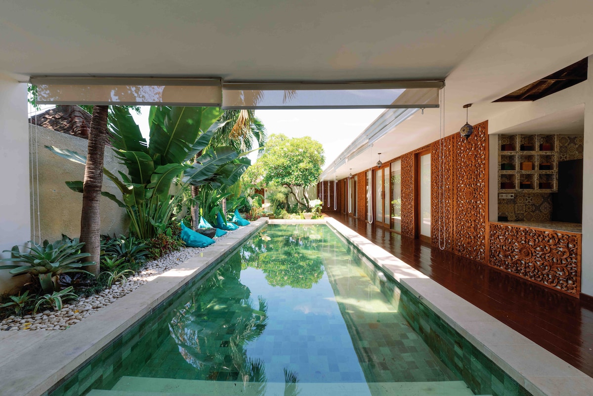 Простора вілла з 3 спальнями, власним басейном і пишним садом, нещодавно відремонтована. Усього за кілька хвилин від пляжу Сіндху, нічного ринку Сіндху та торгового центру Icon Mall Sanur. Ідеально підходить для сімей (і немовлят) або груп, які шукають комфорт і зручність у Санурі Ласкаво просимо до нашої нещодавно відремонтованої вілли з 3 спальнями в центрі Санура! Ця простора вілла має приватний басейн, великий тропічний сад і балійські інтер’єри, створені для комфорту. ※ Доступно на Netflix ※