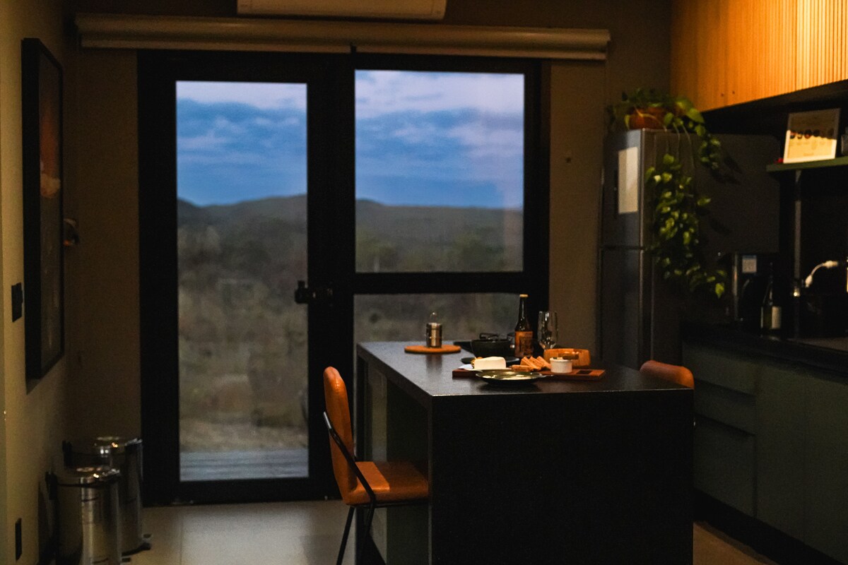 Наше шале повністю інтегроване з природою. Він має великі скляні рами та вільний вид на Серрадо та гори, що забезпечує ефектний вид. Повна кухня, високоякісне ліжко та постільна білизна, чудовий душ з підігрівом, шафа та ліжко з 5-зірковим матрацом готелю. По всій довжині шале є балкон з палубою,з столом і стільцями на вулиці, щоб гості могли споглядати природу і зоряне небо Чападі - звичайно, вино. =)