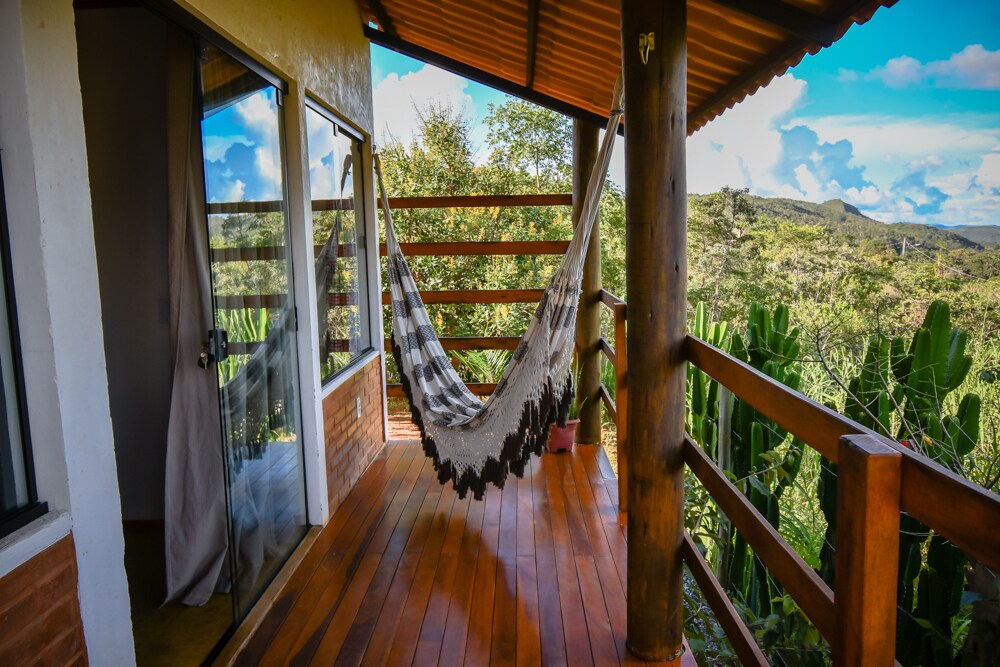 Ласкаво просимо! Ми пропонуємо автентичний і надихаючий спосіб насолодитися Alto Paraíso. Ця шале розташована в 1 кварталі від головного проспекту і призначена для тих, хто шукає спокій і комфорт, хто хоче насолодитися пізнім днем з душем на балконі або просто послухати хороший звук під час приготування цієї чудової вечері. Наш рідний сад наповнений птахами, метеликами та колібрі. * 4p, Wi-Fi, кухня, вентилятор, парковка.