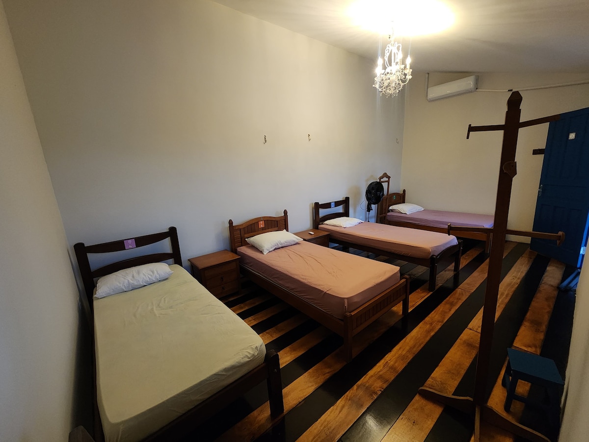 Quarto compartilhado feminino com 4 camas de solteiro, possui armário com chave, ventilador de pé e Ar condicionado programado para funcionar de 19h às 8h. Banheiro e cozinha completa compartilhados. Estadia tranquila, bem localizada, Custo x benefício acima da média, possui um jardim com redes. Café da manhã NÃO incluso na diária; Proibido levar visitas.
