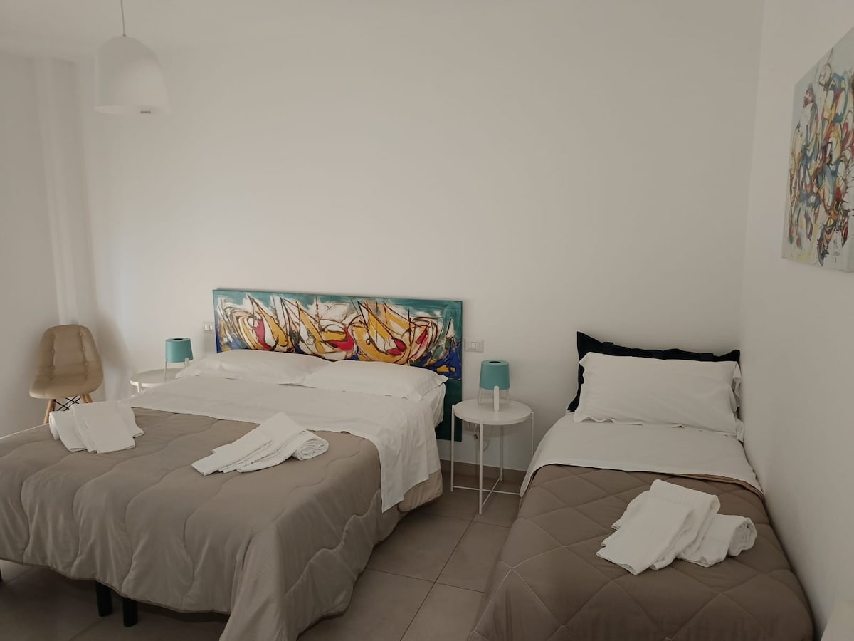 Ласкаво просимо до Oikos Holiday, помешкання, спроєктованого нами, але присвяченого вам. Зробіть своє перебування унікальним. Дозвольте собі насолодитися простотою, гостинністю, чарівністю Сассі, які видно з наших квіткових терас. Побалуйте себе Oikos Holiday, щоб ваша подорож, як у справах, так і для чистого задоволення, залишилася частиною вас. КОНДИЦІОНЕР У ДВОХ СПАЛЬНЯХ ТА НА КУХНІ/У ВІТАЛЬНІ.