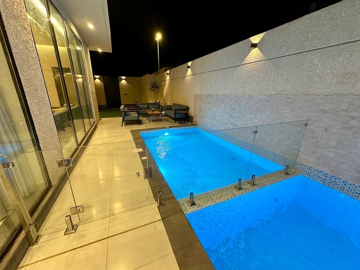 A luxurious guest house for daily rental in Al Malqa district, Riyadh. With an area of 600 square meters, it consists of a large hall, two bedrooms, an outdoor sunroom, a 7x4 meter swimming pool (which can be covered for safety), a small kitchen, an outdoor seating area on the green lawn, and a gas grill. It accommodates up to 4 people for stay and sleep or a lunch/dinner gathering for approximately 10 people. (Children are preferably not allowed).