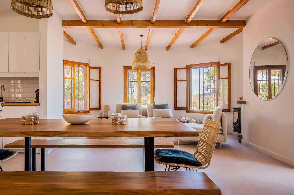 Затишний сімейний будинок для 2 сімей або 1 великої сім 'ї (8 осіб + 2 дитячі ліжечка) з приватним панорамним басейном (9x4 м) з підігрівом з квітня по жовтень через сонячні панелі. Чудовий вид на долину Велес-Малага та Середземне море. Ідеальний будинок для відпочинку для тих, хто любить унікальне розташування, вид на море, природу, красиві заходи сонця та зоряне небо, і, перш за все, спокій.