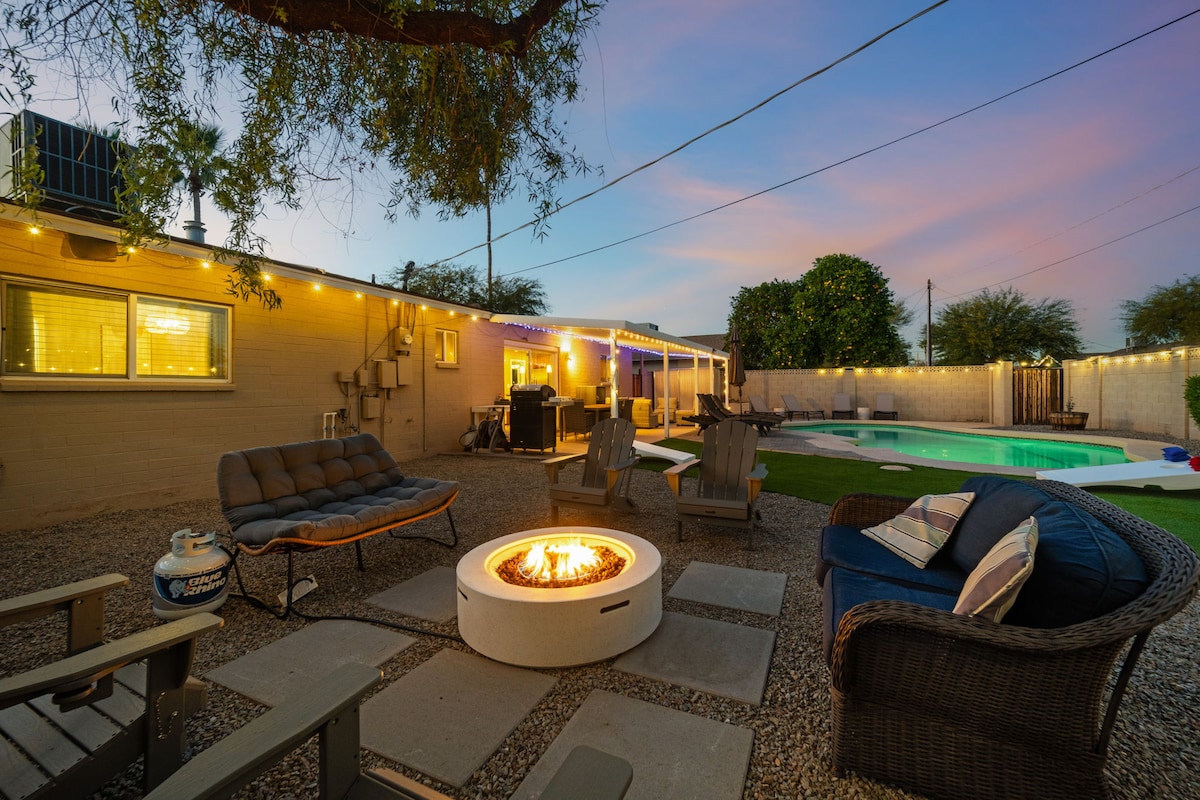 Ласкаво просимо до The Hidden Hacienda Scottsdale! Веселий, химерний відпочинок з ковбой-шикарним декором, басейном, спа-салоном, караоке та іграми - ідеально підходить для девичників, сімей або місць для гольфу. 10 спальних місць зі зручними ліжками, смарт-телевізорами, більярдним столом і повністю укомплектованою кухнею. Відпочиньте під пальмами, потренуйтеся в гольфі на міні-полі або розслабтеся у власному оазисі на задньому дворі з затишним місцем для багаття та телевізором на відкритому повітрі. Хвилини до Кірленд-Коммонс, найкращих полів для гольфу, весняних тренувань і багато іншого!