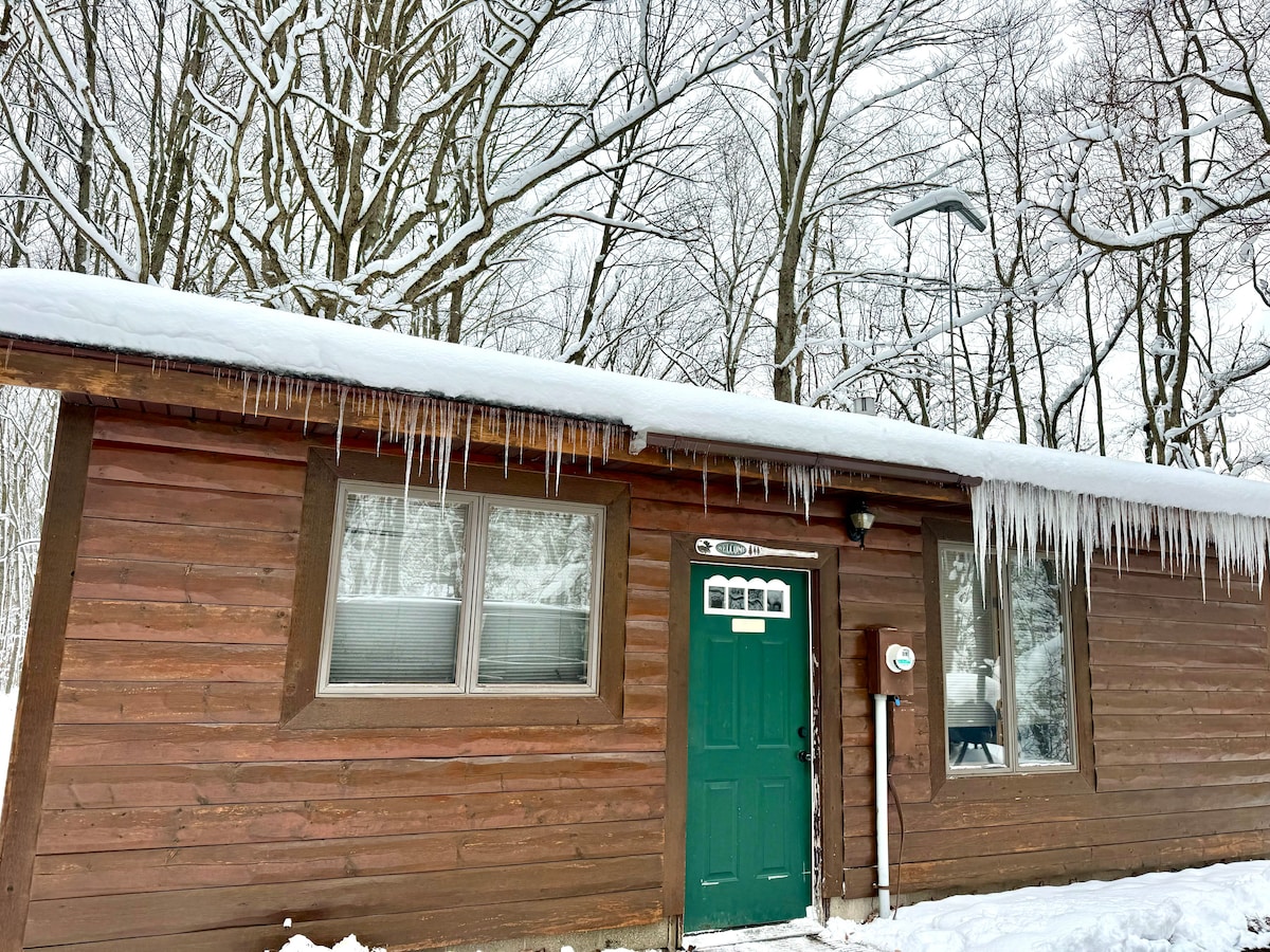 This quiet TINY (144sq ft) gem, privately tucked away and yet very accessible, Cabin Unwind, has a seasonal porch, queen sized bed, a few 'kitchen appliances' and GREAT wifi. The HOUSE SHARED bathroom has it's own side entrance, across from the Cabin. There is a SUMMER SHARED porta-potty and proper shower, right close by, as well. WINTER GUESTS, please note...DON'T come down the driveway without PROPER WINTER tires! Leave your car at the turnaround and I'll gladly shuttle you and your gear.