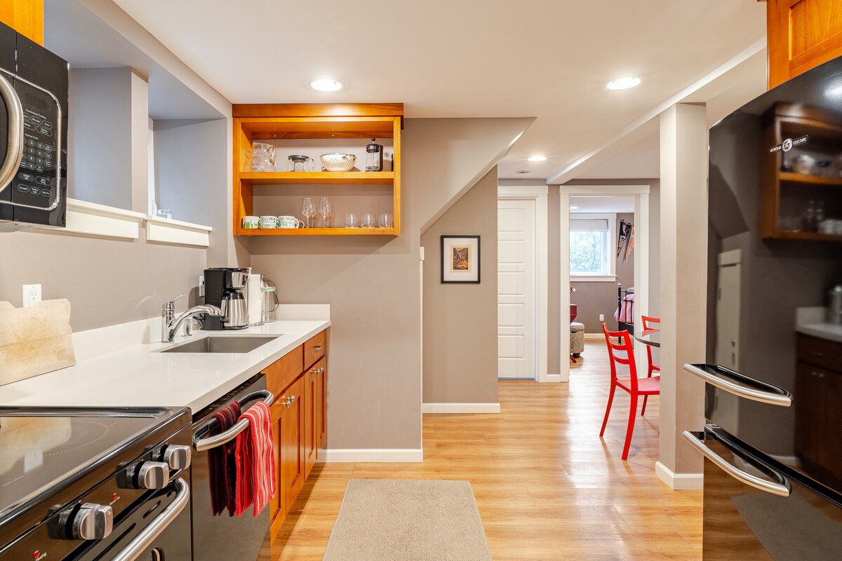 Красиво оформлені з комфортом та приватністю - ці стильні апартаменти з 1 спальнею розташовані на Капітолійському пагорбі. Ця простора квартира площею 600 квадратних футів має власний вхід без ключа з приватним заїздом та паркувальним місцем. У помешканні є повністю обладнана міні-кухня, зручне двоспальне ліжко розміру Queen size з матрацом преміум-класу, 2 смарт-телевізори, пральна/сушильна машина, кондиціонер і приватний відкритий двір. Прогуляйтеся до сусідніх магазинів, ресторанів і продуктових магазинів. Центральне розташування, всього кілька хвилин до центру Сіетла, Медісон-Біч, U-Village, UW та стадіону Husky.