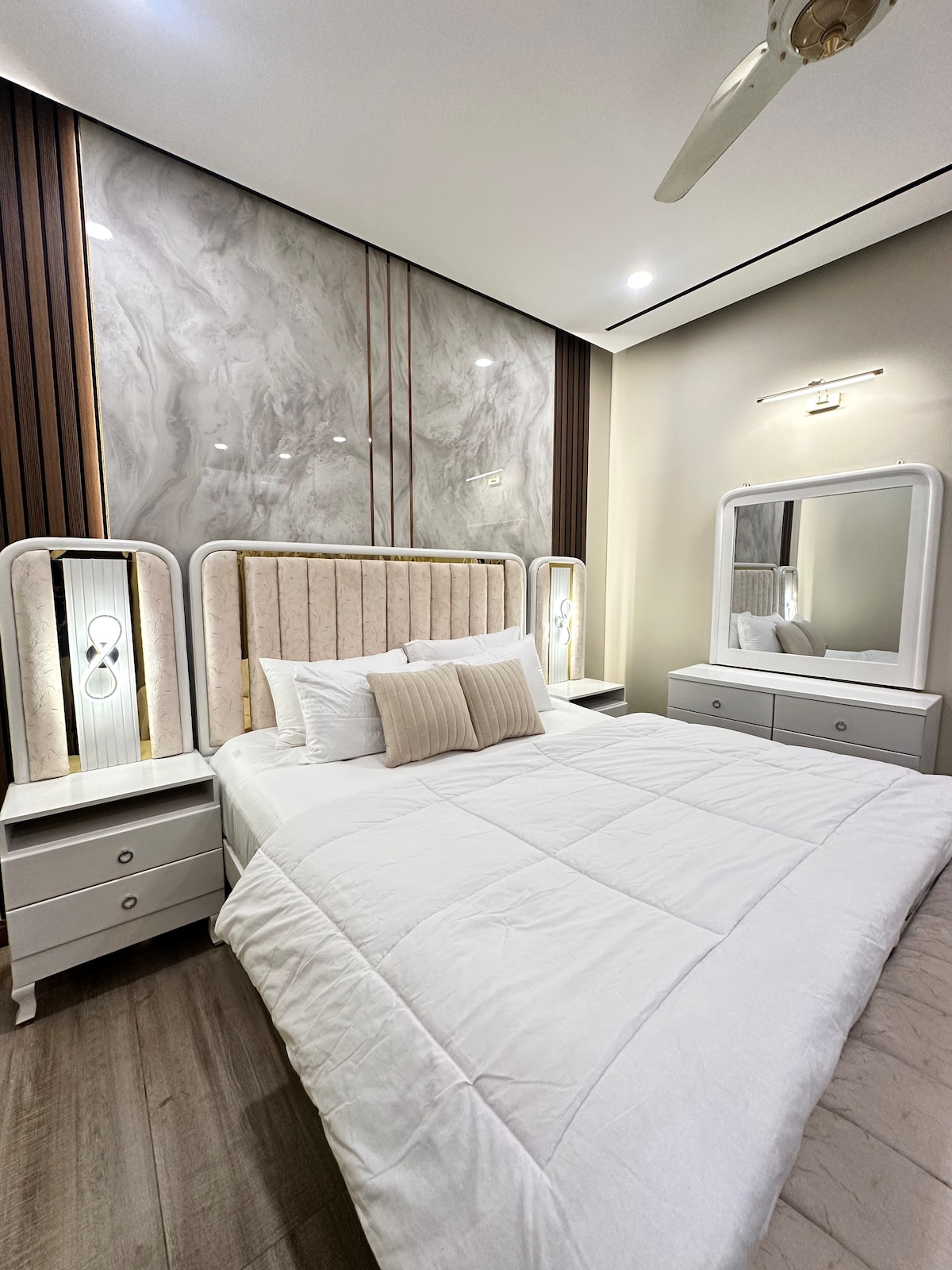 Відчуйте комфорт і стиль у нашій дизайнерській квартирі з 1 спальнею в Бахрія Таун, Фаза 8, Ісламабад/Равалпінді. Ідеально підходить для пар і сімей, має велике двоспальне ліжко, елегантний диван, смарт-телевізор із Netflix і сучасну ванну кімнату. Насолоджуйтеся чудовим краєвидом з 5-го поверху, швидким доступом до ліфта та затишним житловим простором, ідеальним для відпочинку або розваг.