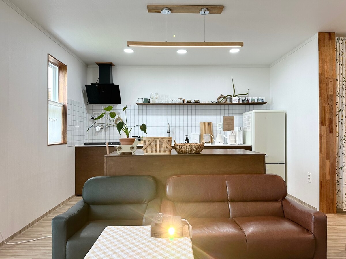 «Pyeongdae Haru» - це помешкання для розміщення до 5 осіб на схід від Чеджудо до Сонгдана, Пхьонде, Сехва, Валь Чонга та Сонсана. Основні напрямки на сході, ресторани та кафе знаходяться в 10-20 хвилинах їзди на автомобілі, Bijarim - в 1 хвилині їзди, а магазин - в 1 хвилині ходьби. Базово, щоб пара господарів прибирала, не відчуваючи себе некомфортно в кожному кутку, а постільна білизна та рушники, які замінюються щоразу, коли ви робите бронювання, були випрані та висушені самостійно. У просторій спальні є ліжко queen-size та постільна білизна у вбудованій шафі, тому ви можете спати на підлозі з дитиною/собакою, а на затишній мансарді є два супер односпальні ліжка та проектор з балкою, щоб ви могли насолоджуватися романтикою мансарди, про яку мріють усі. Меблі, побутова техніка та невеликі прилади ретельно підготовлені, щоб ви могли використовувати їх як сімейний будинок, тому я сподіваюся, що ви приїдете і будете комфортно перебувати зі своєю сім 'єю, друзями, немовлятами та собаками.