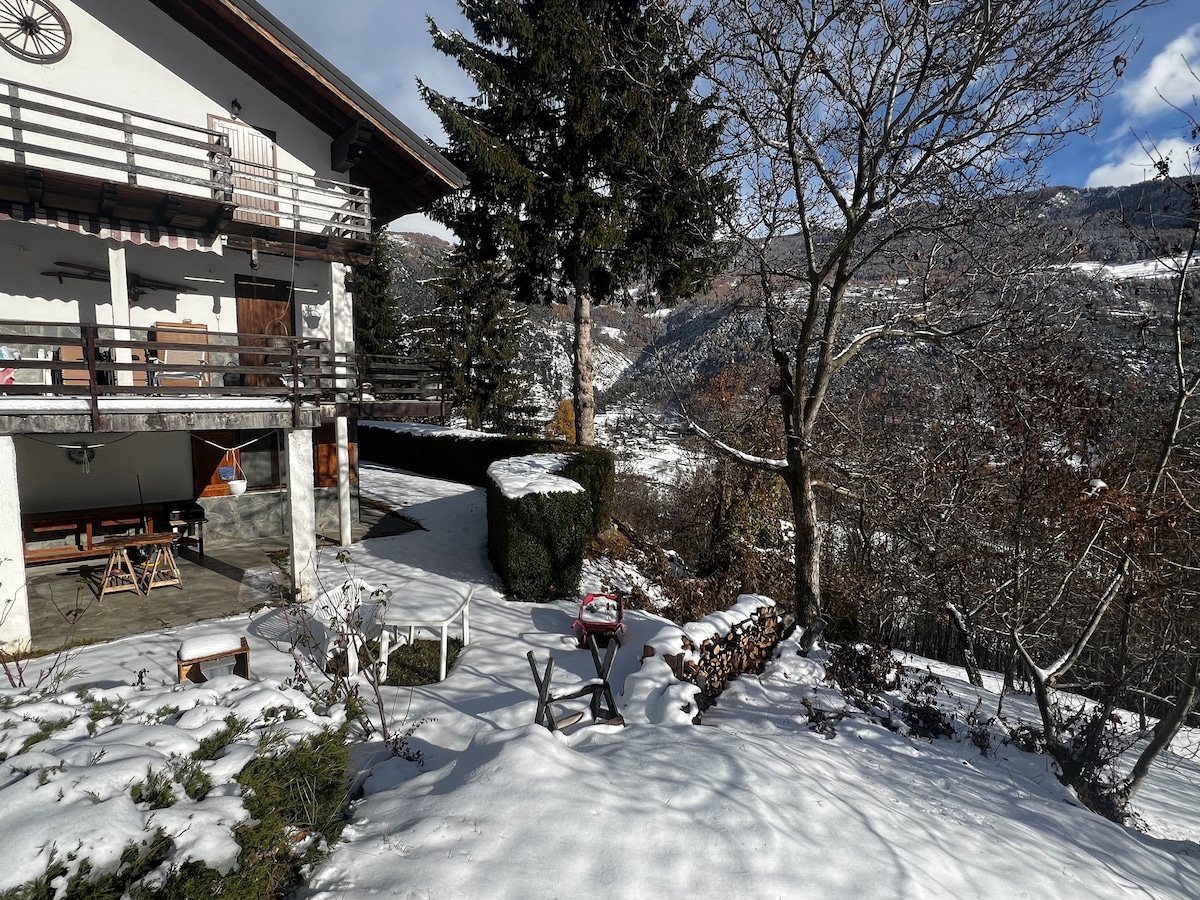 Альпські гори. Італія. Долина Аоста. Зруб у невеликому селищі на висоті 1600 метрів,в спокої лугів, пасуться корів і гір. Сніг (зазвичай) взимку. Місце серця, з любов 'ю відреставроване, що зберігає стародавні балки даху. Чудовий краєвид із великих вікон і особливий спокій для тих, хто шукає спокою, тепла та відпочинку. Меблі дуже гарні: дерево, перш за все, але також більш жваві кольори та сучасні зручності. Тихі екскурсії, як на снігоступах, так і на лижах.