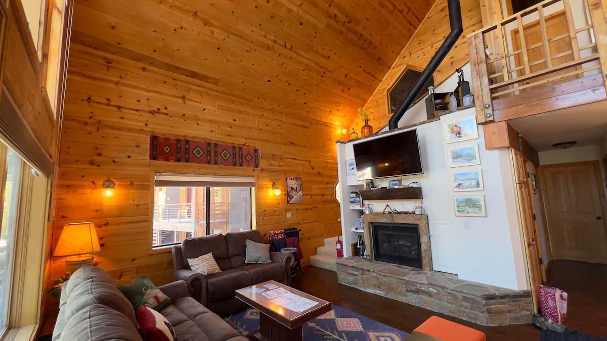 Цей приголомшливий зруб із колод пропонує чудове освітлення та чудову місцевість. План відкритого поверху забезпечує ідеальну обстановку для прийому вашої сім 'ї та друзів у Serene Lakes. Насолоджуйтеся 4 спальнями, 3 ванними кімнатами, газовими камінами та гідромасажною ванною з солоною водою. Сводчасті стелі з великою кількістю просторих вікон з видом на дерева за будинком. Відкритий житловий простір оснащений зручними місцями для відпочинку, настільними іграми, телевізорами та терасами. Коротка прогулянка/поїздка до озера (використовуйте наші байдарки/каное), пляжу та лижних/пішохідних стежок.