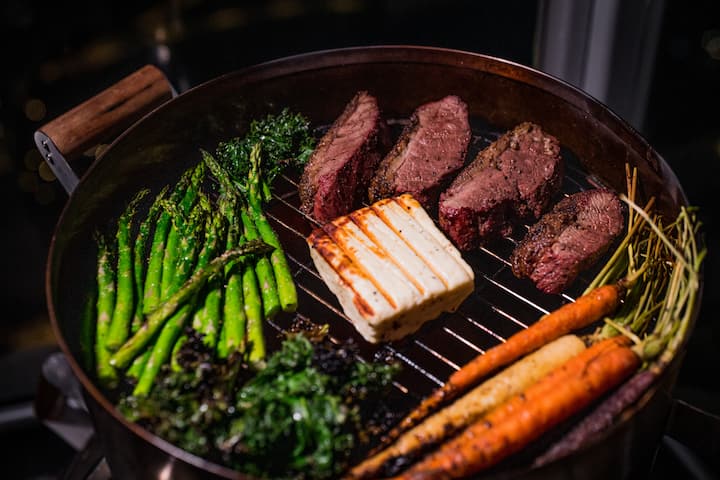 Повноцінне барбекю з 4–5 стравами з нашого меню, приготованими в прямому ефірі зі свіжими продуктами найвищої якості на наших вугільних грилях.