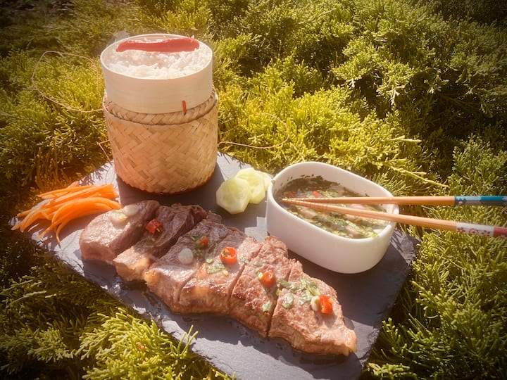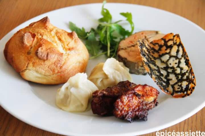 Куряча гьоза, кимбап, яловичина з м’ятою та спеціями