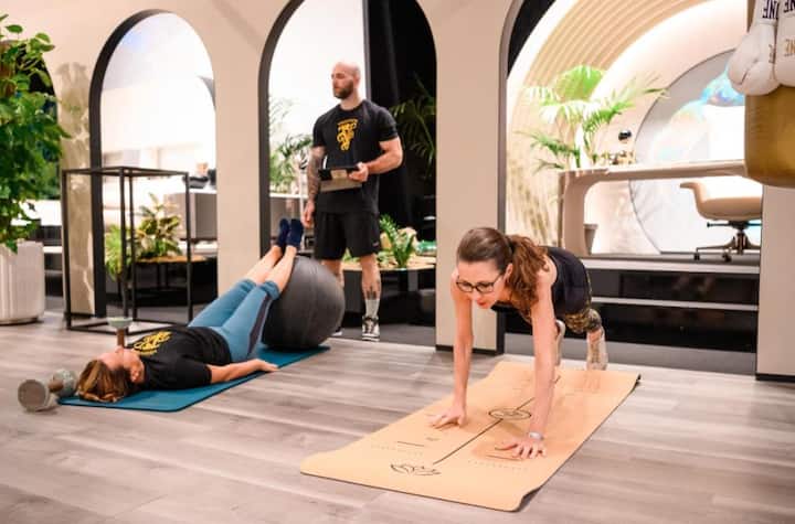 90-хвилинний преміум-урок вдома. Включає семінари з вправ, виконання, методів тренування та створення індивідуальної програми, адаптованої до потреб клієнта + консультації з питань харчування.