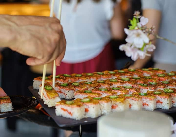Свіжоприготовані ролли суші, як-от: лосось ебі оші, ебі абурі оші, трюфельний лобстер, королівський лосось, торо, негіторо, краб, гостра креветка, блакитний тунець, гребінці хоккайдо, жовтий хвір і авокадо.