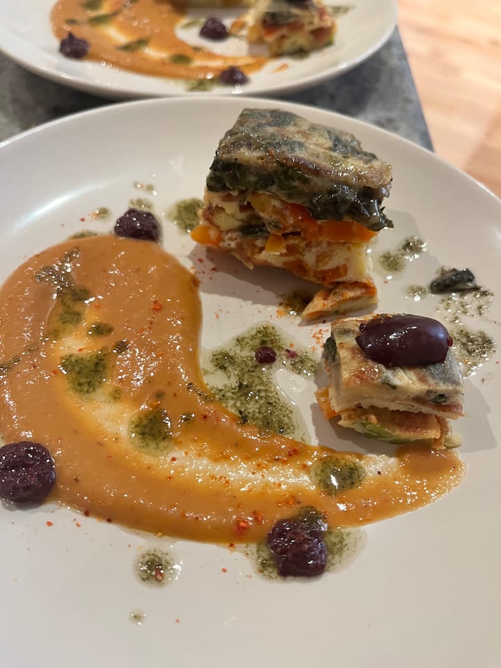 Червона кабачкова ікра з копченим беконом і фуа-гра, молоді пагони з вінегретом
