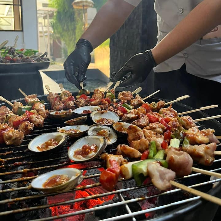 Цю вишукану страву готують на території готелю та подають на свіжому повітрі. Страви включають якісне м’ясо, свіжі морепродукти та різноманітні гарніри, зокрема салати й соуси.